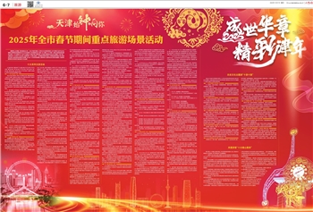 以“盛世华章 精彩津年”为主题,推出“吃”在天津、“玩”在天津、“嗨”在天津、“享”在天津、“忆”在天津、“购”在天津、“哏”在天津、“靓”在天津、“夜”在天津、“住”在天津十大春节文旅活动,推动文旅商体高质量融合发展。