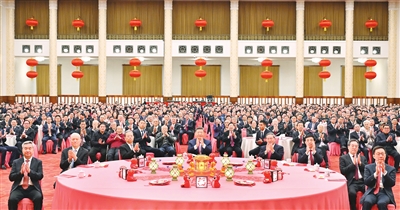 人民大会堂宴会厅灯光璀璨、暖意融融,各界人士2000多人欢聚一堂、共迎佳节,现场洋溢着欢乐祥和的节日气氛。
