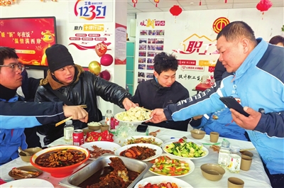 1月27日,位于河西区小围堤道的职工服务中心工会驿站里,50余名快递、外卖“小哥”欢聚一堂,喜迎新年,大家端着热腾腾的饺子,举杯互相祝福。