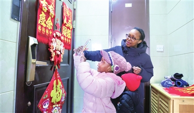 来自肯尼亚的思睿和小女儿在家门口贴福字。 本报记者 孙立伟 摄