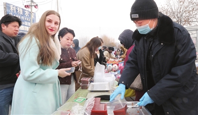 来自意大利的欧阳莎莎与家人一起逛大集。 本报记者 张家民 摄