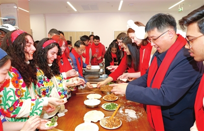 天津大学教师与留学生一起包饺子。 本报记者 姜宝成 摄