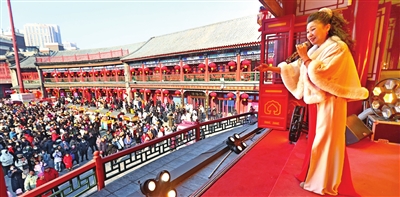“戏楼有戏,快往前走!”大年初一,古文化街戏楼前,人声鼎沸,热闹非凡,随着欢快喜庆的民乐合奏《迎春》的奏响,游人纷纷赶来观看戏楼上的表演,这是天津市曲艺团带来的曲艺快闪演出。