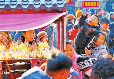 1月29日大年初一,天津古文化街人流如织,各具特色的传统技艺展示吸引着众多游客。吹糖人、捏面人成为孩子们节日的新宠。