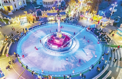 2025年,具有百年历史的意式风情区巴布布冰场再次盛装登场,与游客见面。春节假期的夜晚,游客在声光的渲染下,乐享冰雪世界。 天津日报记者 吴迪 摄