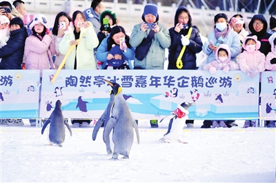 作为北京市二环内最大的戏雪乐园,陶然亭冰雪嘉年华迎来了第十五届盛会。公园南湖北岸的企鹅观赏区吸引了众多游客围观,只见2只王企鹅、2只帽带企鹅、4只巴布亚企鹅拍打着小翅膀朝游客走来,憨态可掬的模样让人忍俊不禁。 北京日报记者 程功 摄