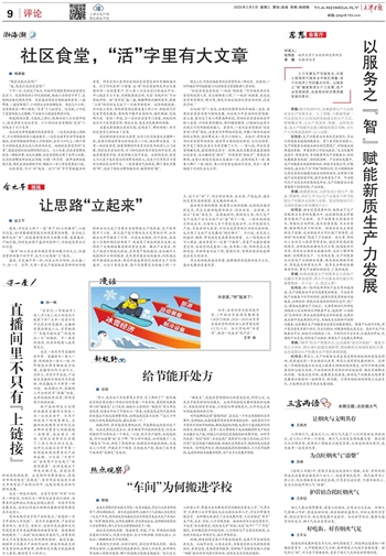在这些文章里最醒目的是新需求。一边是社会进入老龄化,不方便做饭的老人越来越多,一边是大城市生活节奏越来越快,没时间做饭的年轻人不断增加,在家门口吃上一顿干净可口的饭菜成为大伙儿的共同诉求。细读社区食堂里的“文章”,能感受到社会治理的现代范儿。从小处看,社区食堂解决的是一顿饭的事,向大处着眼,社区食堂既方便了老年人就餐,还为社会解决部分就业问题,可谓一举多得。城市治理效能高不高、居民生活品质好不好,都能从一家小食堂里看出门道。