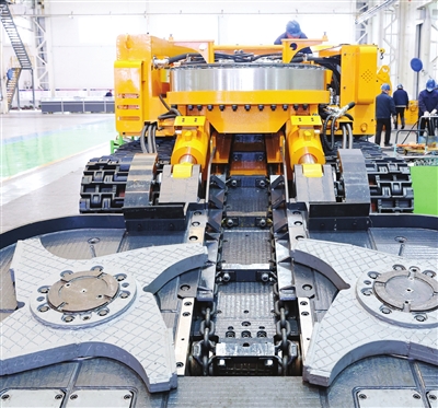 河北省石家庄煤矿机械有限责任公司工人在车间组装掘进设备。