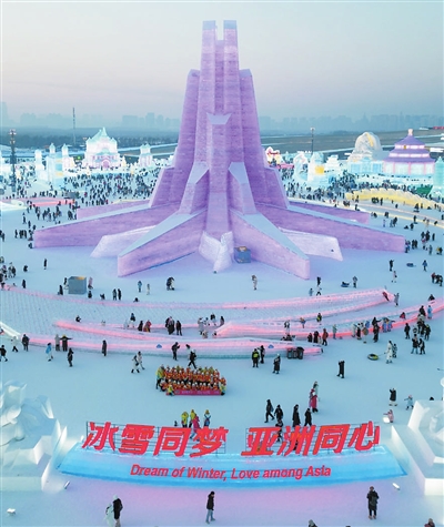 春节期间,哈尔滨冰雪大世界精彩不断。白昼赏冰,剔透冰雕映照日光;夜幕观灯,梦幻光影点亮冬夜。除夕当天,挑战7小时用冰雕刻第九届亚冬会吉祥物“滨滨”“妮妮”,为亚冬盛会献礼。
