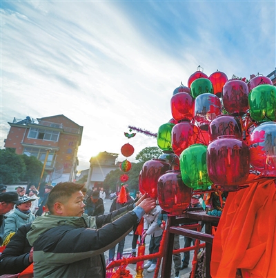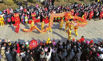 2月10日,浙江省金华市金东区赤松镇虎岩村村民肩扛由100余节板凳组成的传统五彩龙灯,沿村道蜿蜒游舞。每年元宵节前后,浙江省金华市金东区赤松镇的各村村民都会舞起板凳龙灯,祈求风调雨顺、五谷丰登。