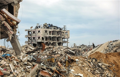 图为2月9日,巴勒斯坦人站在加沙地带内察里姆走廊附近的废墟上眺望。