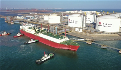 满载液化天然气的LNG船靠泊国家管网集团天津液化天然气有限责任公司码头。