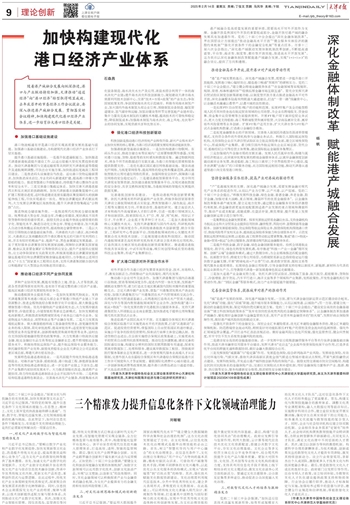 随着港产城融合发展向纵深推进,港口与产业联动持续加强,天津推动“通道经济”向“港口经济”转型取得明显成效。去年底召开的市委经济工作会议提出,要深入推进港产城融合发展。贯彻落实好会议精神,加快构建现代化港口经济产业体系,进一步培育壮大港口经济是关键。