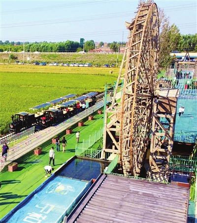 在宁河区宁和稻香生态园,游客乘坐小火车穿行在稻海中。