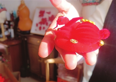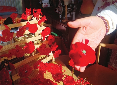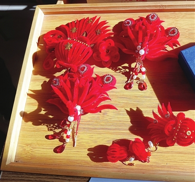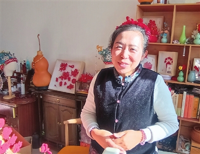 绒花制作工艺非物质文化遗产代表性传承人果兆静和她制作的绒花。