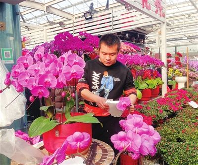曹庄花卉市场的商户宋先生为蝴蝶兰摆造型。