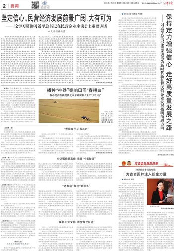 “新时代新征程民营经济发展前景广阔、大有可为”。在日前召开的民营企业座谈会上,习近平总书记从中国式现代化建设全局的高度,深入分析当前民营经济发展面临的机遇和挑战,深切勉励广大民营企业和民营企业家“在困难和挑战中看到前途、看到光明、看到未来,保持发展定力、增强发展信心,保持爱拼会赢的精气神”。
