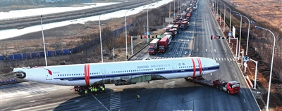 2月19日上午,记者联系了天津东疆综合保税区文化和旅游局(以下简称东疆文旅局)以及运送飞机的天津华北集团有限公司(以下简称华北集团)。华北集团文旅板块负责人武连松介绍,这架飞机是中国第一架退役的空客A330-200,是欧洲空中客车工业公司研制的双过道宽机身客机,从南方航空公司退役。飞机总长度58.82米,翼展60.30米,有400余个座位。为了保存飞机的完整性,华北集团采用海运的方式进行运送。1月底,从湖北宜昌三峡国际机场出发,到达上海后转为海运,在海上经历了大风大雨,历时20多天抵达天津。由于飞机体积庞大,运送这个“庞然大物”有一定的困难,需要精细规划道路通行方案。于是在飞机运送之前,华北集团做了很多次的演练,精准到每一个位置,甚至每一个路口。武连松说:“据我所知,全国有运输飞机的先例,但基本都是小型飞机。这么大的飞机,整机运送应该是全国首例。”