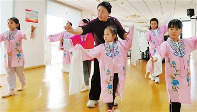 京剧老师周兢指导少儿京剧培训班的小学员。