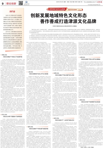 “潞卫交流入海平,丁沽风物久闻名”。独特的地理位置和特殊的历史际遇,造就了天津城市的成长发展,也积淀了底蕴厚重、富有特色的天津文化。地域文化是中华文明的有机组成部分。深化天津地域文化研究,透过其多元多样、多彩多姿的外在特征,把握发展主脉和文化主体,是推动文化传承发展、展现中华文明现代力量的基础性工程。