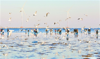 在东疆亲海公园,游客与海鸥“亲密互动”。