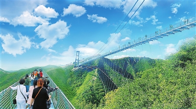让游客心跳加速、刺激感倍增的还有风景区推出的亚洲最长的7D玻璃悬索桥,站在透明的玻璃桥上,脚下是深不见底的山谷,耳边是呼啸的山风,惊险刺激之余,四周美景尽收眼底。