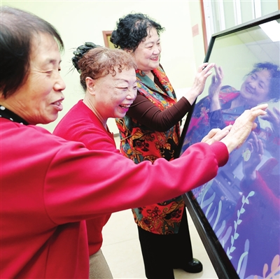 此外,服务中心还配备了智能化康复等设备,老人可根据大屏幕上的提示,选择想锻炼的部位,系统会扫描捕捉老人的躯干动作,再通过小游戏的方式,指导老人康复训练。小小的一面电子音乐鼓,敲起来很带劲儿,老人跟着节奏敲鼓,可以锻炼手眼协调能力,也能帮助小脑萎缩的老人进行康复训练。还有一台游戏机,内置特殊种类的游戏,可以锻炼老人大脑灵活性。张美萍告诉记者,这些智能设备的引入,除了科学帮助老人进行康复训练,还有一个重要的作用——鼓励老人们学习新事物,体验新生活。