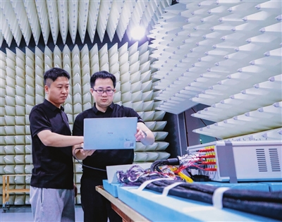 在实时监控区,工作人员一边盯着电脑屏幕上的警戒线,一边认真记录。“实验室里正在进行电池管理系统的电磁测试,测试时间约10个小时。当测试结果高出屏幕上的警戒线,系统会报警提示。”赵鹏程告诉记者,现在超50%的测试都来自新能源汽车零部件。