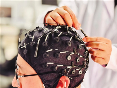 中电云脑工作人员检查脑电波采集帽电极连接情况。