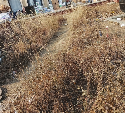 记者近日在现场看到,曹庄花卉市场位于外环西路一侧大门旁边的花坛里,已经干枯的花草和杂草混在一起,将近一米高,没有处置。中间有一条被人踩出来的小路,通往附近的商户。花坛里有商户放置的花篮等物品,“小路”边上以及杂草里,有被人随意丢弃的快餐包装等杂物。花坛前面随意停放的车辆下面,也有很多垃圾。