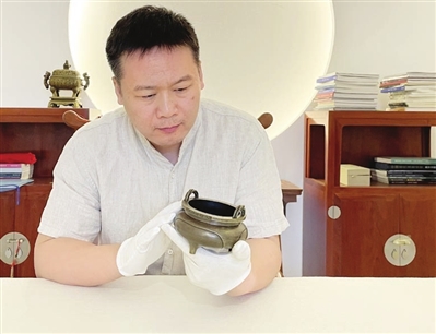 博物馆内陈列的宣德炉藏品可谓琳琅满目,对王斌来说,其中有一只鹌鹑熏炉不能不提。“2023年底,我在外地一个小型拍卖会上,无意中相中了这款小炉,当时看起来古香古色,漆黑无比,只能从模样看出是鹌鹑熏炉,两个翅膀是盖子,打开盖子放进香材,烟从口中喷涌而出,鹌鹑形态惟妙惟肖。经过后期清理后,鹌鹑熏炉呈现通体纯银材质,鹌鹑脊背羽毛和胸前绒毛雕刻清晰细致,尤为可爱。中国明清时代用香盛行,一个小小鹌鹑熏炉足以证明古时手工艺匠人巧夺天工的创作,以及用香、品香的人群对艺术的追求高度,能用得上铜器本已经奢华至极,用白银錾刻雕琢出鹌鹑作为熏香,不禁令人为古人赞叹。很多前来参观的中小学生都表示,生活在城市里没见过鹌鹑,但是在国画中见过,中国画会以鸳鸯、鹌鹑为题材,寓意安居乐业、安贫乐道。由于鹌鹑是‘一夫一妻’,因此也寓意夫妻和美。这一件小小的熏炉,从工艺样式上有古人审美的体现,从寓意也彰显出古人对精神文化的追求。”王斌馆长表示,目前这款鹌鹑熏炉的复制呼声最高,他计划在今年复制这把鹌鹑熏炉。