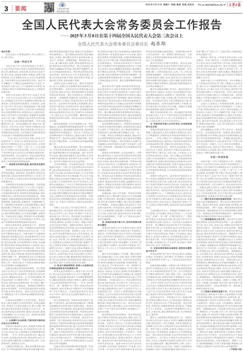 2025年是“十四五”规划收官之年。常委会要在以习近平同志为核心的党中央坚强领导下,坚持以习近平新时代中国特色社会主义思想为指导,全面贯彻落实党的二十大和二十届二中、三中全会精神,深刻领悟“两个确立”的决定性意义,增强“四个意识”、坚定“四个自信”、做到“两个维护”,深入学习贯彻习近平法治思想、习近平总书记关于坚持和完善人民代表大会制度的重要思想,坚持党的领导、人民当家作主、依法治国有机统一,发展全过程人民民主,认真行使宪法法律赋予的立法权、监督权、决定权、任免权,稳中求进推动人大工作高质量发展,为以中国式现代化全面推进强国建设、民族复兴伟业作出新贡献。