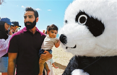 图为一名儿童在新西兰奥克兰举行的新西兰中国儿童文化日活动上与大熊猫人偶互动。