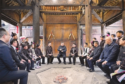 3月17日至18日,中共中央总书记、国家主席、中央军委主席习近平在贵州考察。这是17日下午,习近平在黔东南州黎平县肇兴侗寨考察时,在信团鼓楼同村干部和村民代表围坐在火塘边,共话乡村全面振兴。 新华社记者 谢环驰 摄