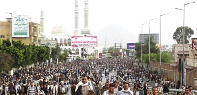数万民众17日在也门胡塞武装控制的首都萨那举行大规模集会,抗议美军对也门境内胡塞武装目标进行空袭。 新华社发