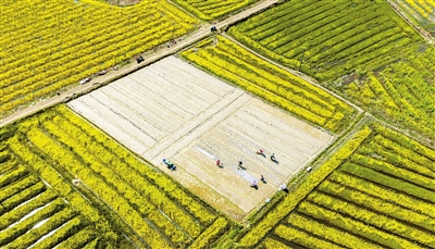 3月19日,在湖南省娄底市双峰县井字镇白碧村一处早稻集中育秧点,农民在秧田里劳作(无人机照片)。