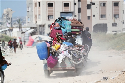 图为3月18日,被迫逃离加沙地带北部拜特哈嫩的巴勒斯坦民众经过加沙城。