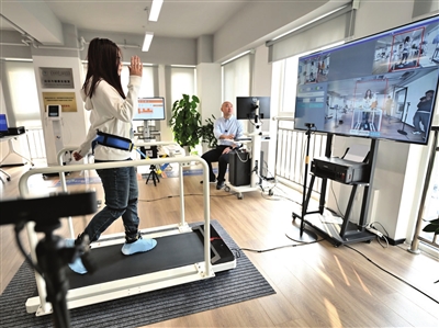 工作人员在进行运动认知评估与训练系统的测试。天津睿祺医疗科技有限公司主要产品为基于数字交互技术的运动认知脑功能状态评估系统,采用前沿的人工智能与人机交互技术,通过眼动识别、语音识别、动作识别等交互技术,结合传统神经认知测评方法,量化大脑神经反应。
