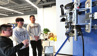 天津大地机器人有限公司的工程师刘旭文(左一)在讲解磁吸附机器人的工作原理。大地机器人致力于推动大型储罐表面处理特种机器人的应用,研发团队独立开发的集成“水喷砂”“超高压水”等技术的爬壁机器人,能够自动化完成储罐及其他金属构筑物表面的清洗和防腐作业,显著提升了作业效率和安全性。