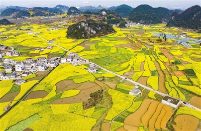 近日,贵州省六盘水市六枝特区木岗镇的15000余亩油菜花竞相绽放。金黄的油菜花同田地、道路、民居构成一幅幅美丽的春日画卷。 新华社发
