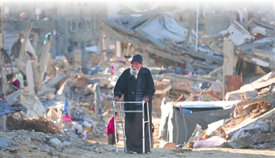 3月22日,一名从加沙地带北部拜特拉希耶撤离的巴勒斯坦老人经过加沙城。