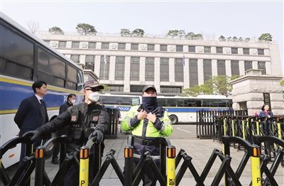 3月24日,在韩国首尔,警察在韩国宪法法院前执勤。 新华社发