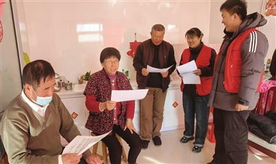 大辛村村干部上门宣传《村规民约》。 照片由宁河融媒体提供