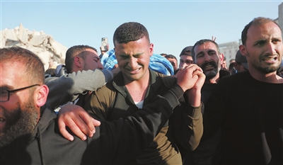 在加沙地带中部的代尔拜拉赫,阿布·贾比尔在废墟旁说:“我们度过了一个可怕的夜晚。有一个15岁的女孩还在废墟下,还有一个5岁的男孩,我们还没把他们找出来。”贾比尔说,那一夜,大家本以为还在停火,还可以安睡,但爆炸就这么发生了。