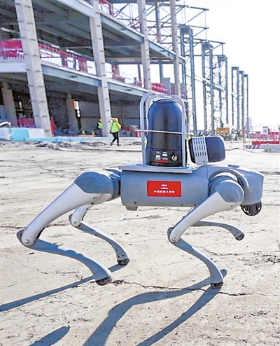 近日,由中铁建大桥局引进的AI(人工智能)巡查机器狗在天津空客二线施工现场投入使用。AI巡查机器狗不仅能跑会跳,还拥有红外光学摄像头、高清摄像机以及激光雷达等,通过编程可以在施工现场开展危险源检测、智能巡检等多项工作,任务完成后还可自己返回充电。记者 张磊 摄