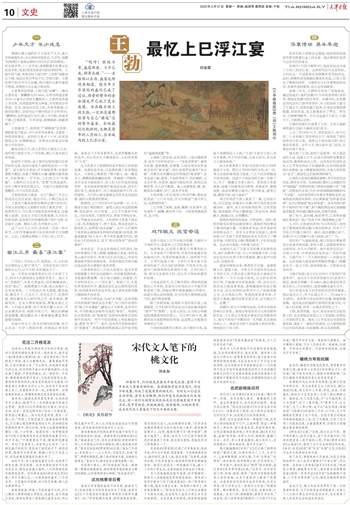 阳春时节,灼灼桃花在春风中摇曳生姿,惹得千百年来文人墨客竞相吟咏。我国植桃赏花历史悠久,经过不断发展,形成了意蕴厚重的桃文化。宋时文人们追求生活情趣、讲究生活格调,他们妙笔生花把桃文化发扬光大,使一系列与桃有关的民俗及文化意趣更趋于丰富多彩:花节赏桃花、折枝瓶插花、桃符避邪、仙桃祝寿等,成为宋代文人墨客笔下经久不衰的主题。