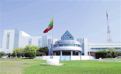 图为4月1日,位于缅甸首都内比都的缅甸广播电视台总部降半旗志哀。