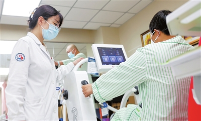 天津市第三中心医院减重降糖健康管理中心工作人员为患者监测身体指标。