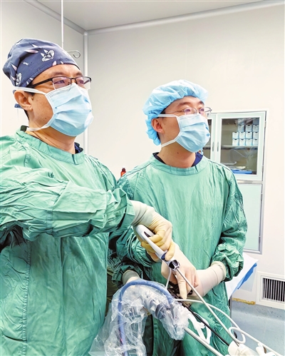 天津市第三中心医院胃肠外科庄建彬主任(左)在为患者进行单孔腹腔镜下袖状胃切除术(减重代谢手术)。 受访者供图