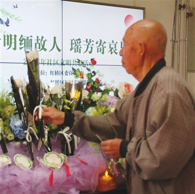 活动尾声,天津市殡仪服务总站工作人员通过敬献祈福灯、诵读追思词的方式,带领居民共同参与这场庄重而肃穆的追思仪式。